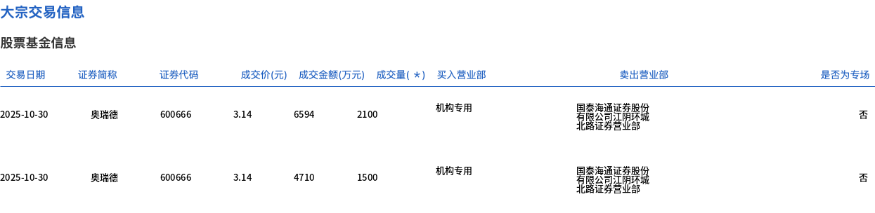 10月30日,奥瑞德大宗交易成交3600万股,成交额1.13亿元,占当日总成交额的33.49%,成交价3.14元,较市场收盘价3.24元折价3.09%。